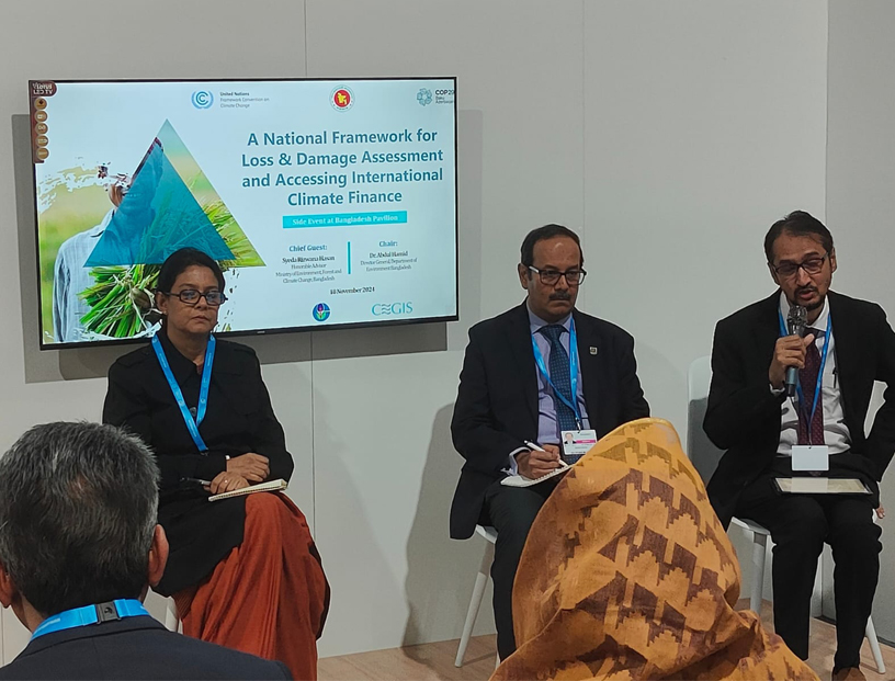 The project, titled "A National Framework for Loss and Damage Assessment and Accessing International Climate Finance," is initiated by the Department of Environment (DoE) with intellectual services provided by CEGIS. Mr Malik Fida A Khan, Executive Director of CEGIS, delivered the keynote presentation, elaborating on the concept and approach of the framework, which aims to address climate-induced challenges and facilitate access to international climate finance. The side event for the project was held at the Bangladesh Pavilion during the ongoing COP29 in Baku, Azerbaijan on Monday, 18 November 2024. Syeda Rizwana Hasan, Honorable Adviser, Ministry of Environment, Forests, and Climate Change, delivered speech as chief guest at the event. Distinguished dignitaries in attendance included Dr. Farhina Ahmed, Secretary of the Ministry of Environment, Forest and Climate Change (as Special Guest); Dr. Abdul Hamid, Director General of the Department of Environment (DoE); and Mr. Mirza Shawkat Ali, Director, Department of Environment.