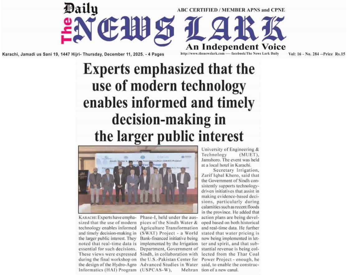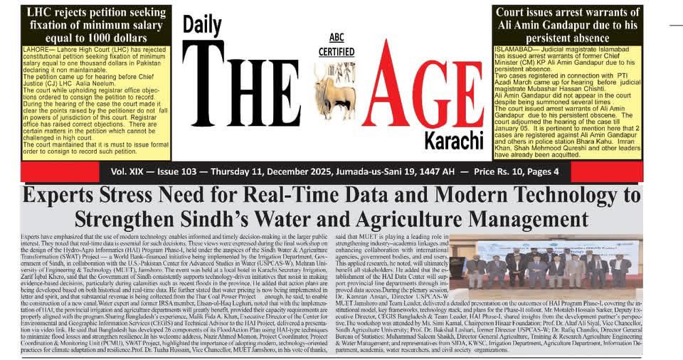 The Sindh Water & Agriculture Transformation (SWAT) Project, a World Bank-funded project carried out by the Irrigation Department, Government of Sindh in partnership with the US-Pakistan Center for Advanced Studies in Water (USPCAS-W), Mehran University of Engineering and Technology (MUET), Jamshoro, organized the final workshop for Phase-I of the Hydro-Agro Informatics (HAI) Program on December 11, 2025, at a hotel in Karachi, Pakistan. The project's Technical Advisor, Mr. Malik Fida A. Khan, Executive Director, CEGIS, discussed Bangladesh's experience, while the team leader, Md. Motaleb Hossain Sarker, Deputy Executive Director (Operations), CEGIS, discussed the viewpoint of development partners.